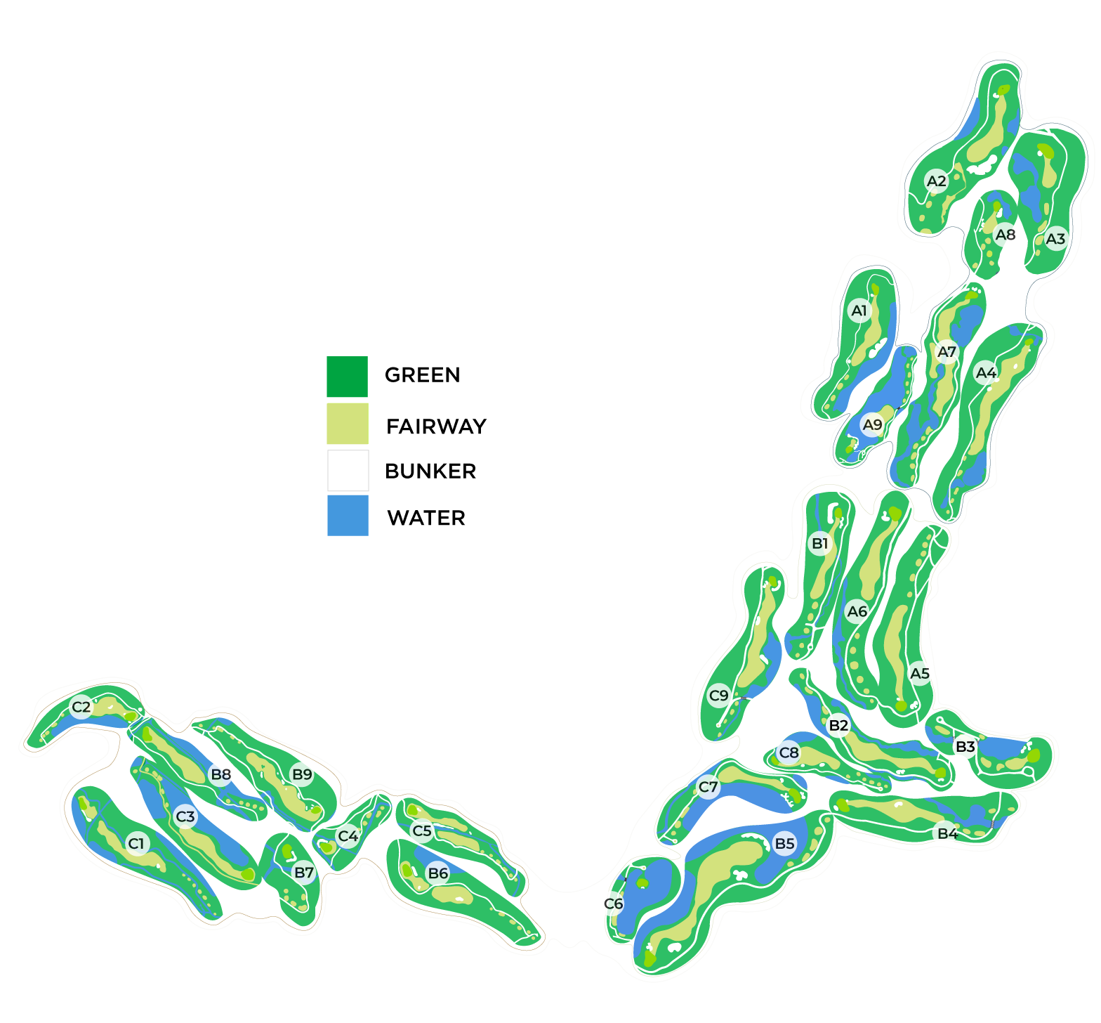 แต่ละคอร์สมีเอกลักษณ์เฉพาะตัว ด้วยภูมิประเทศที่แตกต่างกัน พร้อมดีไซน์ที่ชวนให้นักกอล์ฟต้องวางแผนและใช้เทคนิคอย่างรอบคอบ ไม่ว่าจะเป็นแท่นทีที่ยกระดับ กรีนที่ล้อมด้วยอุปสรรคน้ำ หรือแฟร์เวย์ที่โอบล้อมด้วยธรรมชาติอันงดงาม สามารถชมรายละเอียดของแต่ละหลุม พร้อมแผนผังสนาม ได้จากแผนที่ด้านล่างนี้